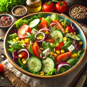 - Gurke in Scheiben, Tomaten in Spalten, Paprika in Streifen und die Zwiebel in feine Ringe schneiden. Mais abtropfen lassen. Alles zum Salat geben.